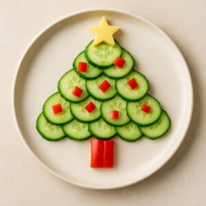 Du legst Gurkenscheiben, Brokkoli, Zucchini oder Paprika so auf einen Teller, dass ein klarer Tannenbaum entsteht.