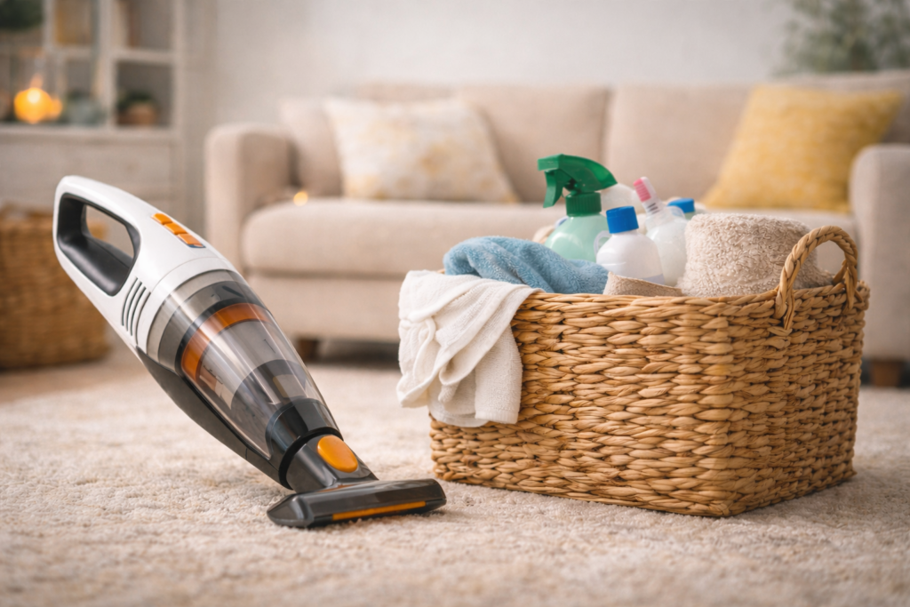 (z. B. Korb oder Wäschewanne, Staubsauger oder Tuch)
