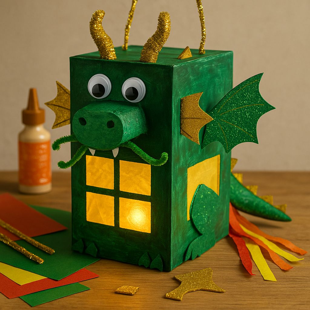 Grün, funkelnd, ein bisschen magisch: Diese Laterne besteht aus Karton oder einer Klopapierrolle, Transparentpapier und Pfeifenreinigern. Kinder basteln Schuppen aus Glitzerpapier und formen kleine Hörner. Die Laterne wirkt stark, freundlich und mutig – wie ein kleiner Beschützer im Dunkeln.